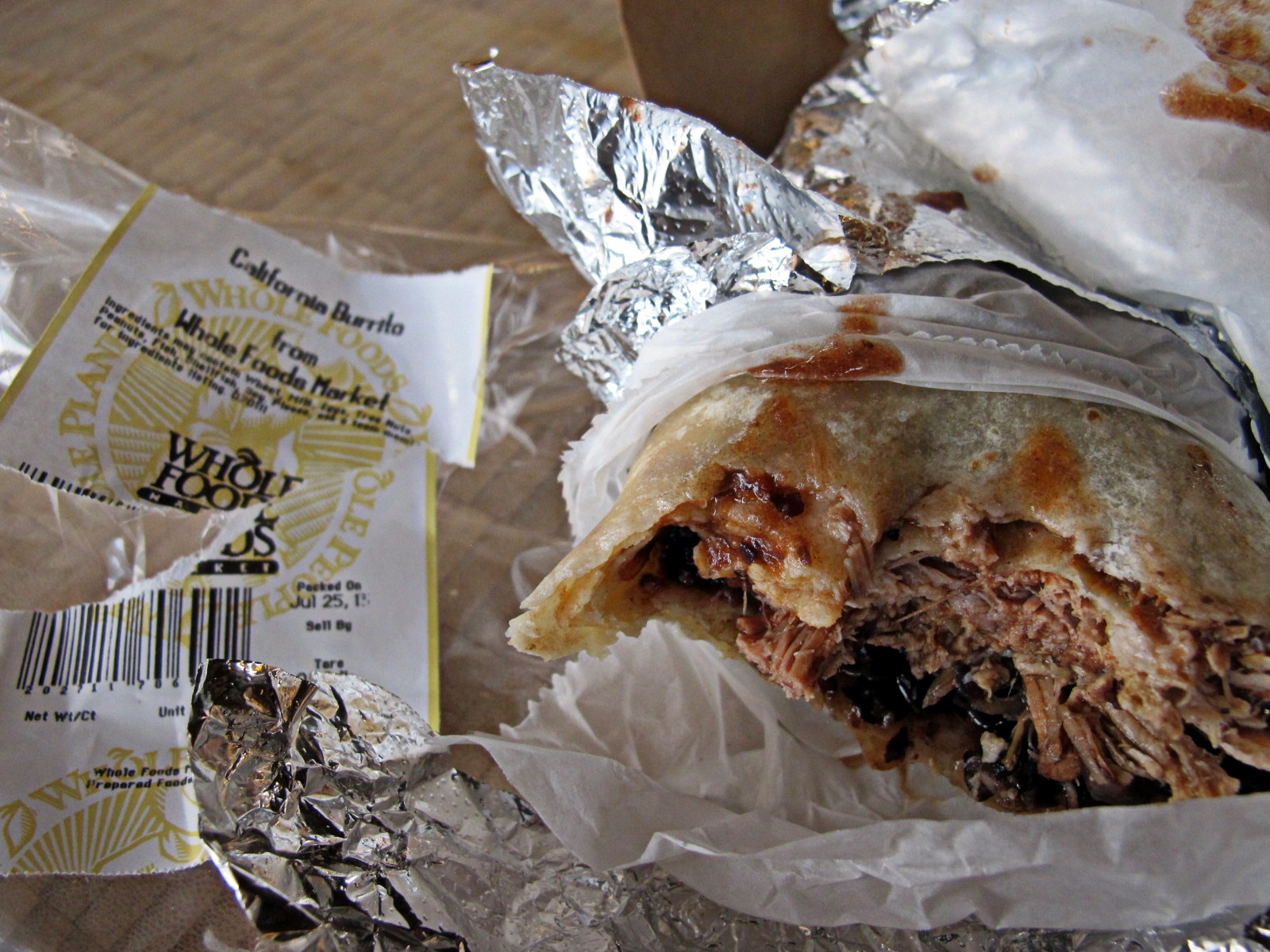 The menu was surprisingly limited, with burritos, chimichangas (deep-fried burritos, I was told) and enchiladas being the basic fare. I went for the enchiladas, and Leigh had the chorizo and potato burrito. My enchiladas came in a plastic container, and were covered in a deep brown sauce, melted orange cheese and shredded lettuce. Served with refried beans and rice, they were tasty, but again, unlike anything I’ve had in Mexico or Los Angeles. Leigh’s burrito, however, was wonderful! I’m sure I’ll be going back to Carolina’s.